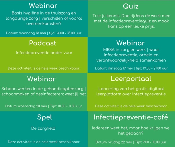Alle informatie over het programma en aanmeldmogelijkheden is te vinden op onze website: Activiteiten – Infectiepreventieweek